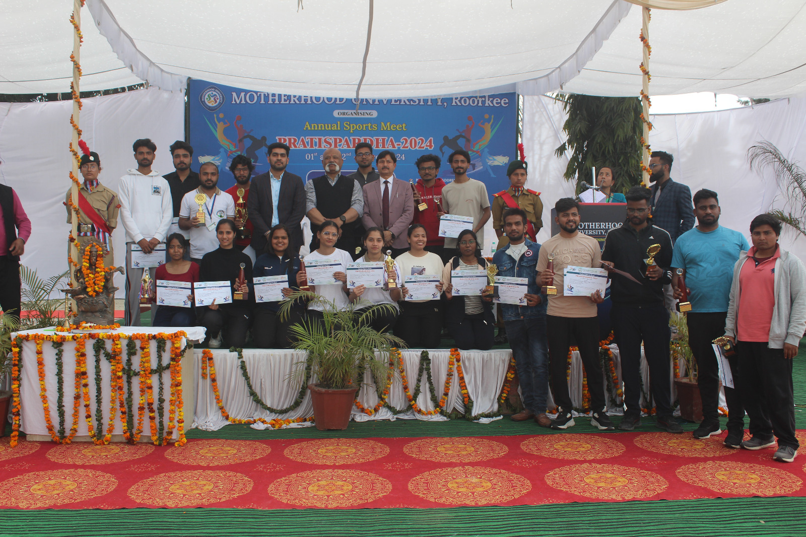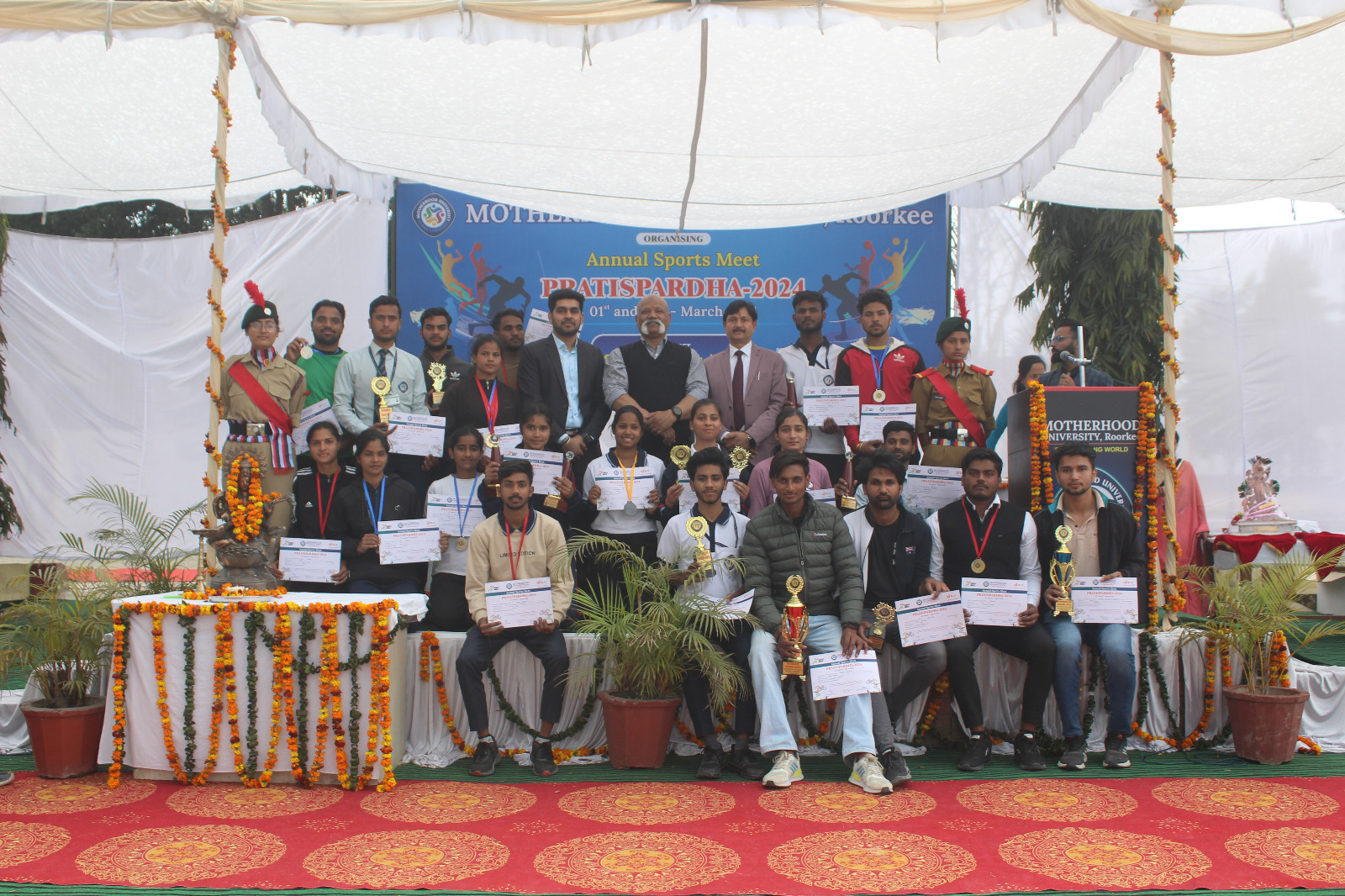 आज मदरहुड विश्वविधालय में दो दिवसीय वार्षिक खेल प्रतियोगिता के दूसरे समापन और पुरस्कार वितरण के दिन -02/03/24 का शुभारंभ मुख्य अतिथि श्री अमित सिन्हा , आईपीएस(अपर पुलिस महानिदेशक- प्रशासन/एफएसएल) और विश्वविधालय माननीय कुलपति प्रो०(डॉ०) नरेंद्र शर्मा ने स्यूंक्तरूप से माँ सरस्वती जी प्रतिमा के समक्ष दीप प्रज्वलित करके किया। समापन और पुरुष्कार वितरण समारोह भव्य रूप किया गया। विश्वविधालय कुलपति ने मुख्य अतिथि को स्मृति चिन्ह और पुष्पगुच्छ देकर उनका स्नेह अभिनंदन और स्वागत किया। उसके पश्चात ने विश्वविधालय के निदेशक प्रशासन – श्री दीपक शर्मा ने मुख्य अतिथि को पुष्प गुच्छ देकर उनका स्वागत किया। उसके बाद मुख्य अतिथि, कुलपति जी और निदेशक प्रशासन ने के सभी विनर विभिन्न खेलों में विनर और रनरअप टिम को ट्रॉफी और प्रशस्ति पत्र देकर सम्मानित किया। जिसमें कबड्डी की विनर टीम के कप्तान कार्तिक और पूरी टीम को ट्रॉफी और प्रशस्ति पत्र दिया गया। कैरम में कप्तान सोहब को विनर ट्रॉफी,बैडमिंटन लड़कियों में विनर निशु रही,हाई जम्प में पारुल और आमिर,जवेलिन थ्रो में अश्वन्त ,रेस 100 मीटर लड़कियों में सलोनी,लड़कों में विकास रुहेला ने प्रथम स्थान प्राप्त किया। इसी क्रम में मदरहुड आयुर्वेदा अस्पताल और मेडिकल साइंस(बीएएमएस)के समस्त विनर और रनरअप छात्र/ छात्राओं को भी ट्रॉफी और प्रशस्ति पत्र दिया। जिसमें आयुर्वेदा की वॉलीबॉल में विनर टीम कप्तान विपिन को पुरुष्कृत किया गया।
